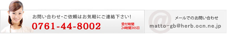 | 連絡先 | TEL : 0761-44-8002 ファックス : 0761-44-8003 E-mail : matto-gb@herb.ocn.ne.jp |